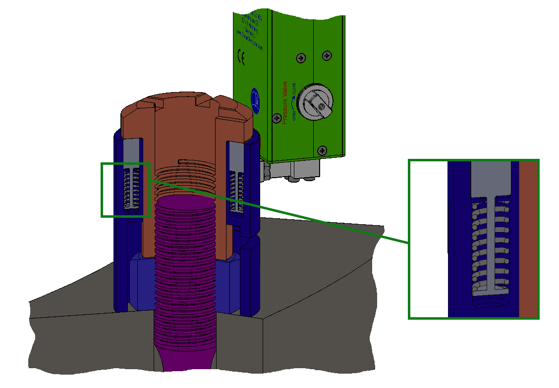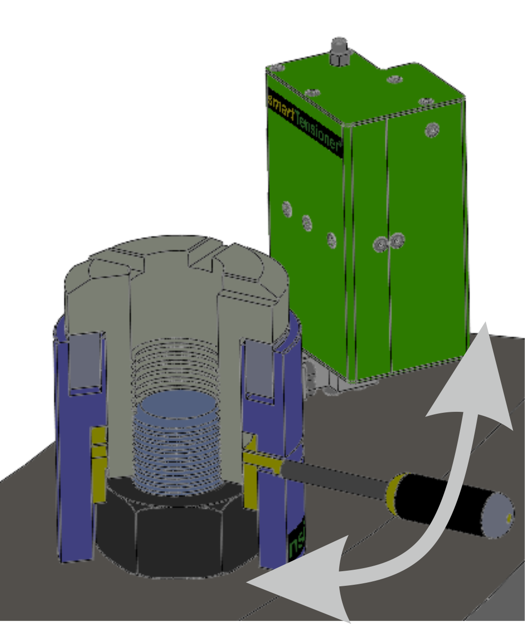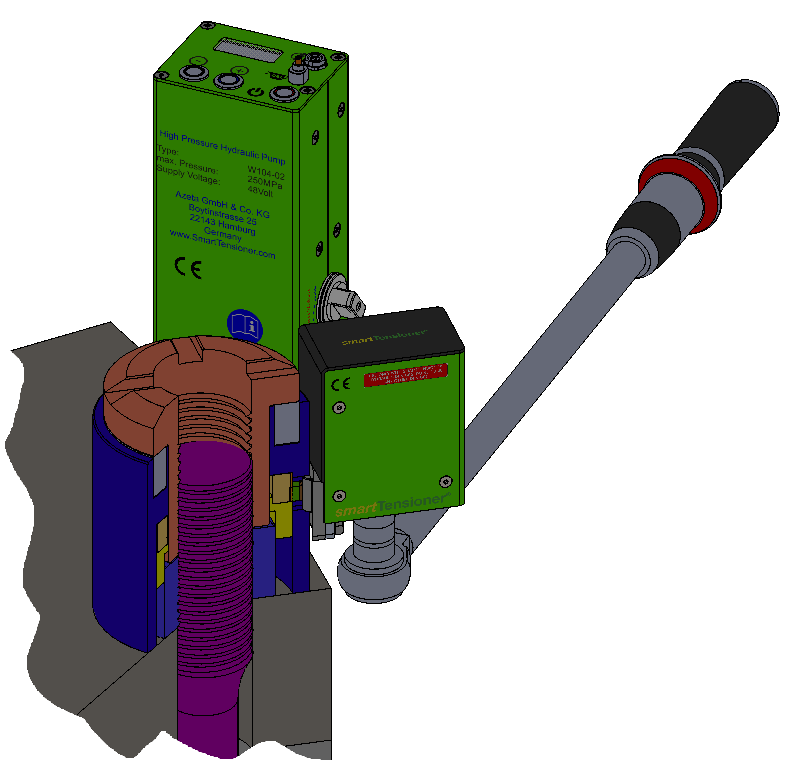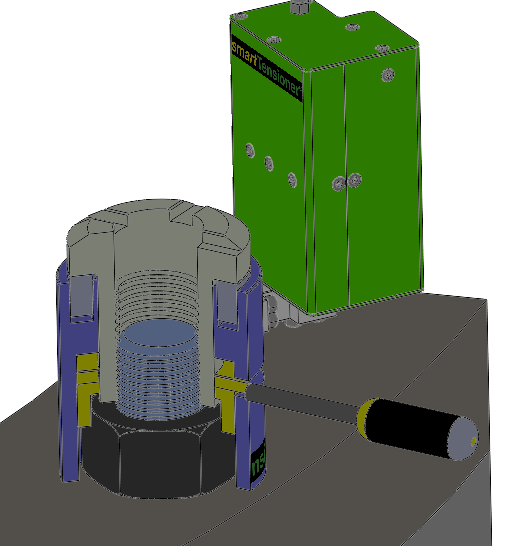 The NutAdapterSpring allows to mount the BoltTensioner in any position of the hexagonal nut. If the nut adapter should not match the nut, it is shifted upwards. After the turnimng the adapter, it will glide on the nut supported by a spring.