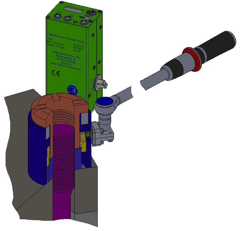 Manual piston returnAfter use, the piston of the BoltTensioner might not be in it's initial position. It therefore needs to be pressed back using an appropriate press, e.g. with a plain vice (not included). We only recommend this option for seldom used tensioners.Spring piston return Since all smartTensioner BoltTensioeners feature an integrated pump, the overall amount of oil in our hydraulic systems is very low. This allows us to use integrated springs to automatically pull the piston back in it's initial position after use. This system does not need any manual interaction. The BoltTensioner is always ready to use. Hydraulic piston returnFor bigger tensioners or tensioners with long stroke, we recommend our HydraulicPistonReturn-system. After manually operating an integrated valve, the pump is used to press the piston back in it's initial postion. More information available on request. |